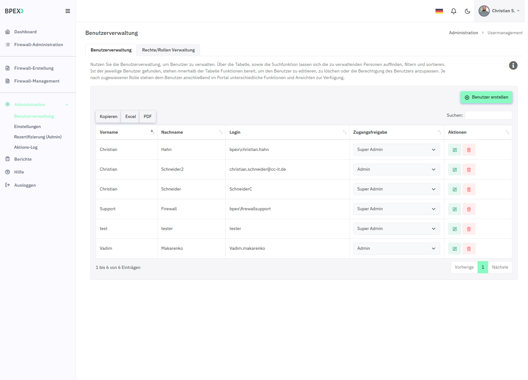 Exportfunktionen für gängige Formate wie PDF, Excel und CSV ermöglichen flexible Auswertungen und Audit-Reports.