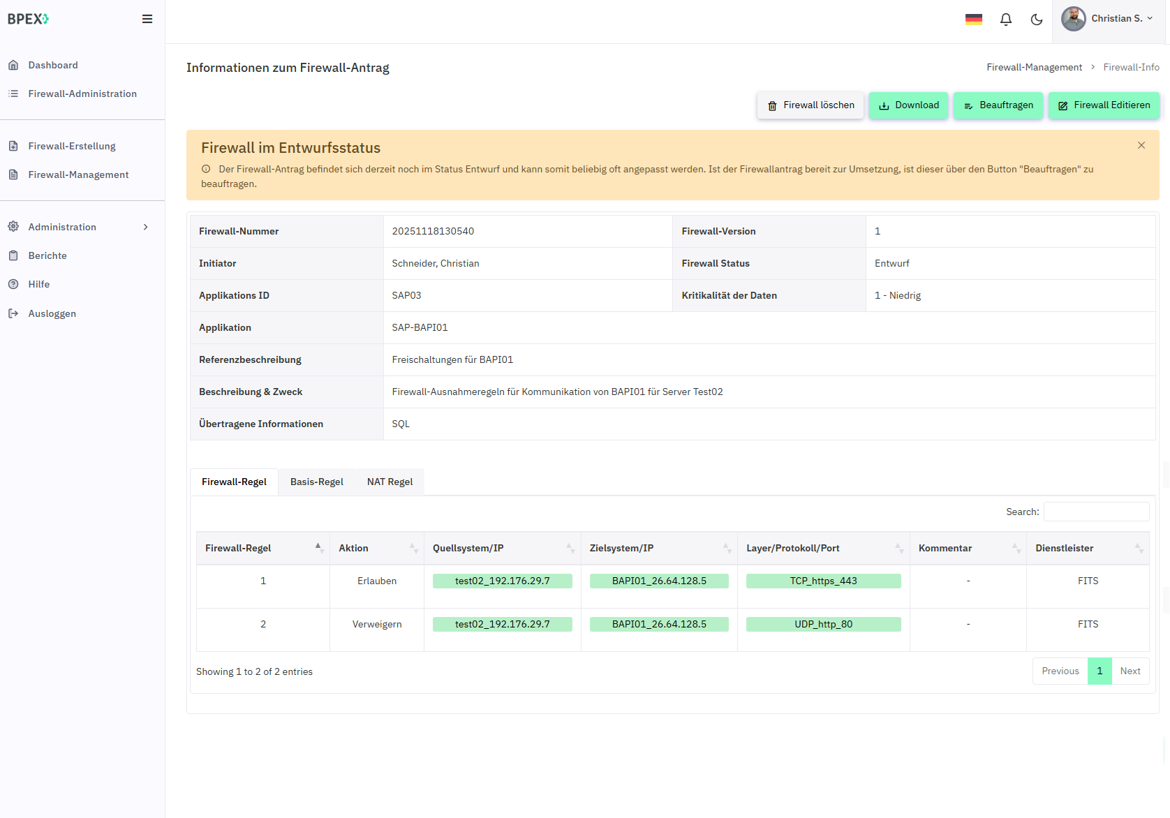 Zur Sicherstellung der Aktualität und Notwendigkeit von Firewall-Freischaltungen - vollständig integriert im Portal.