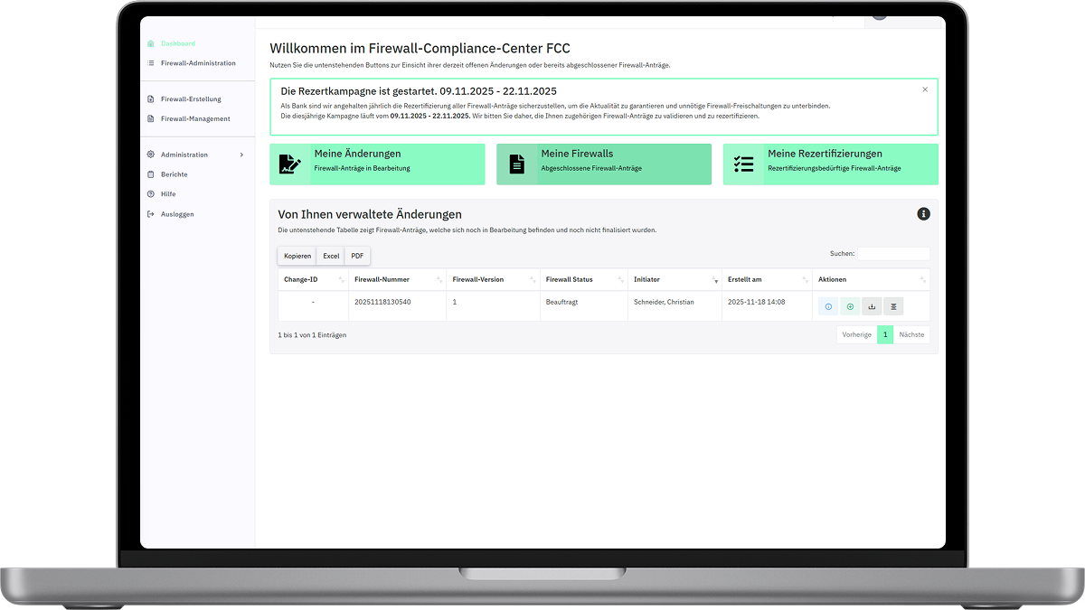 Das FCC ist ein webbasiertes Self-Service-Portal zur Beantragung, Verwaltung und Rezertifizierung von Firewall-Freischaltungen.
